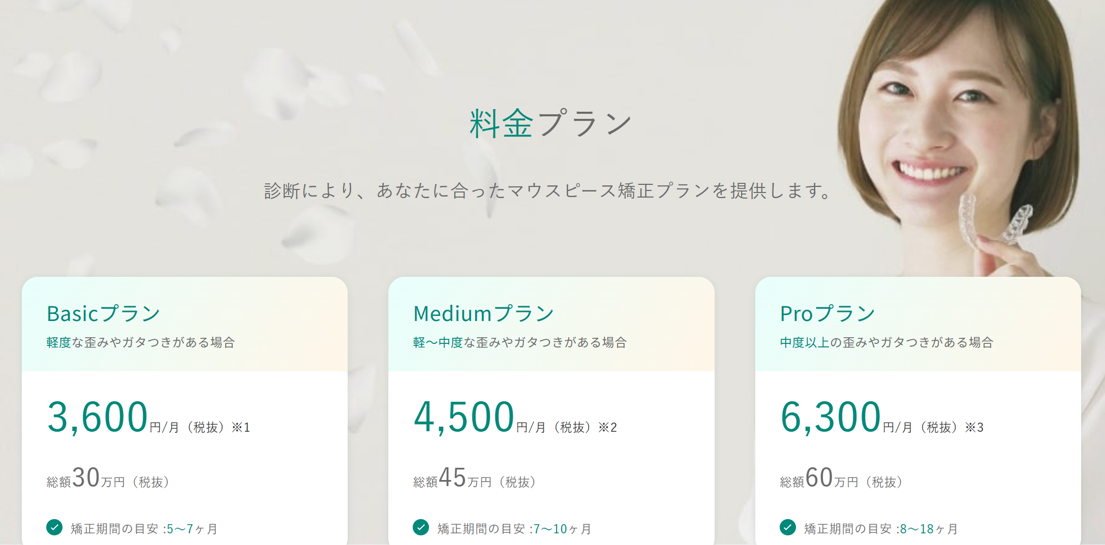 3つ目は、料金が明確で追加費用が発生しにくい点です。症例に応じて3つのプランが用意されており、それぞれの総額料金が一目でわかるシンプルな料金設定です。治療の途中で追加のマウスピースが必要になっても無料で対応してもらえるため、予算を立てやすく安心して治療を受けられます。